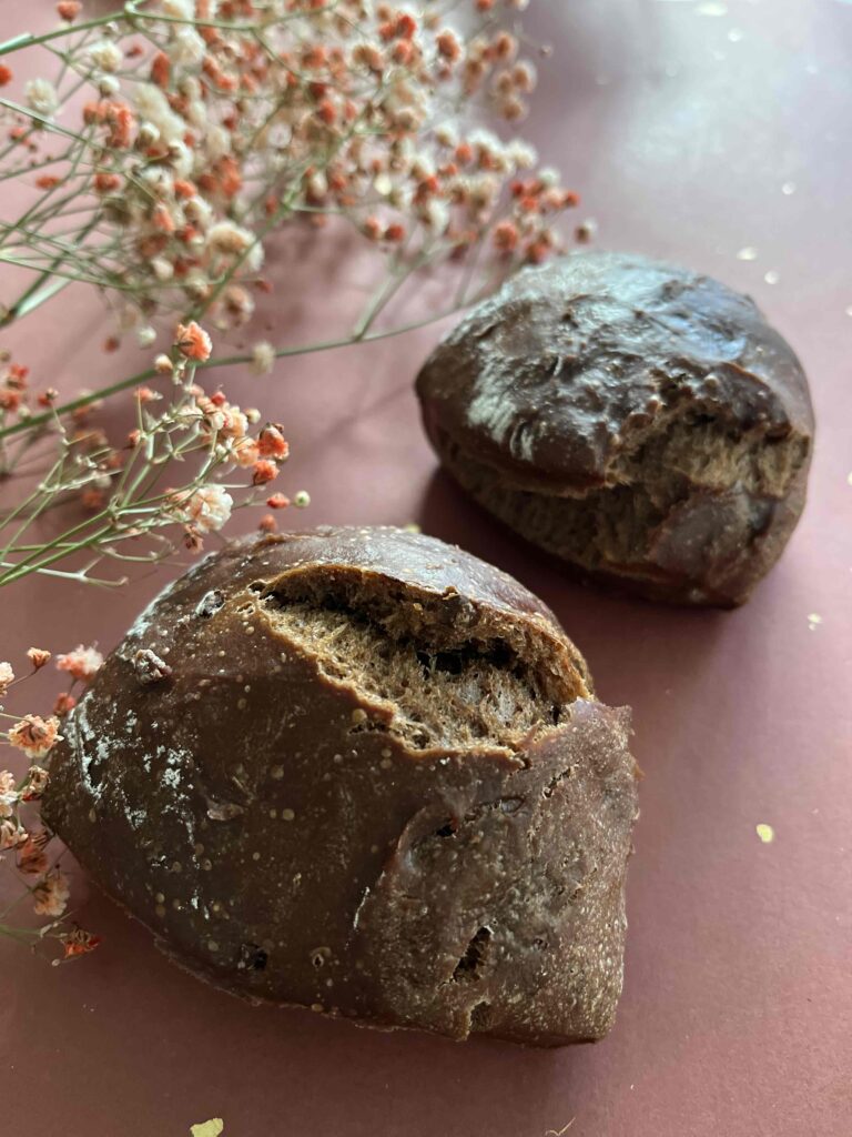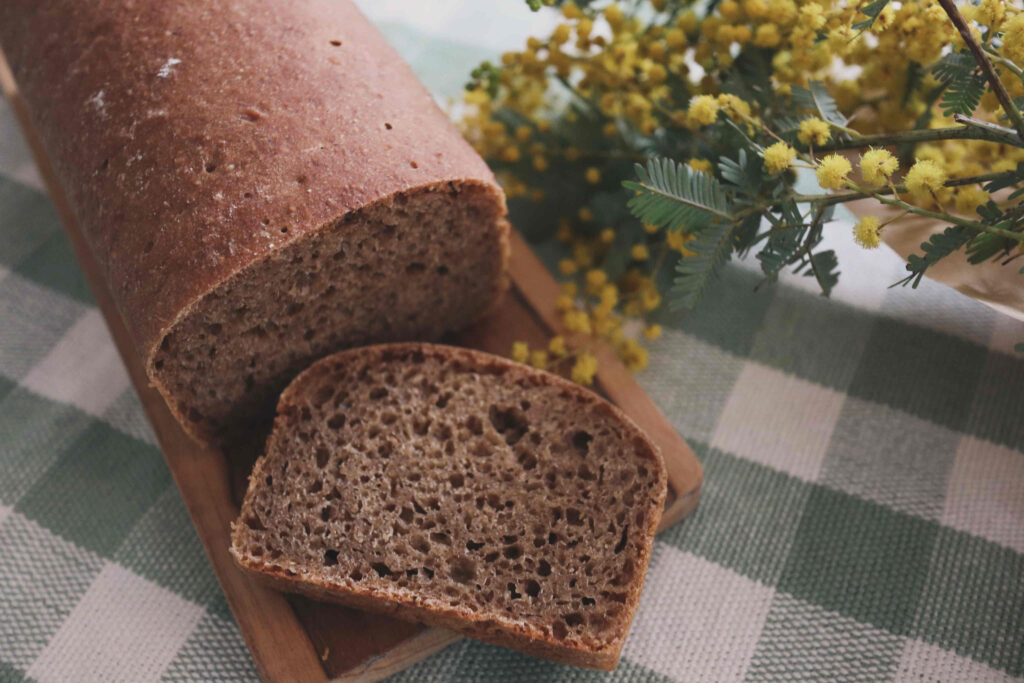 強力粉、全粒粉、ライ麦粉、蕎麦粉の四種の粉を配合した滋養高いパンです。インスタントコーヒーで香りを付け、食べやすく仕上げています。薄切りにしてチーズやクリームチーズを塗って食べるのがオススメです。