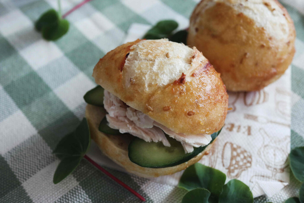 ごまを練り込んだプチパンに、味噌だれを塗って焼き上げます。香ばしいパンに、しっとりと茹でた胸肉のバンバンジーを挟んでサンドにします。